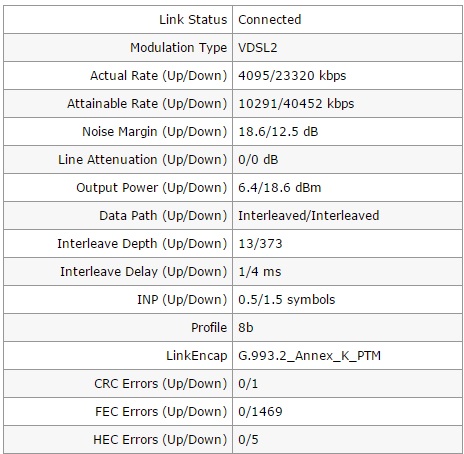 ovako imam onaj zte router novi dosao. Prije sam ping u igrama imao 30 i bio mi iskljucen interleaving i sada ih danas zvao da mi ga opet iskljuce kao imi ga iskljucili ali ping sada cijelo vrijeme 60-70. dali je moguce do routera? I dali je moguce da sam sta radim po routeru da bi si popravio malo ping? i vidim da imam adsl a svi vi imate vdsl dali mogu kako traziti da me se stavi na vdsl? ovo je od mog routera Link Status Connected Modulation Type ADSL_2plus Actual Rate (Up/Down) 1006/9156 kbps Attainable Rate (Up/Down) 1010/12880 kbps Noise Margin (Up/Down) 8.9/7.9 dB Line Attenuation (Up/Down) 20.1/39.5 dB Output Power (Up/Down) 13.3/18.8 dBm Data Path (Up/Down) Interleaved/Interleaved Interleave Depth (Up/Down) 4/384 Interleave Delay (Up/Down) 2/6 ms INP (Up/Down) 0.5/3 symbols Profile N/A LinkEncap G.992.3_Annex_K_ATM CRC Errors (Up/Down) 0/21 FEC Errors (Up/Down) 0/89577 HEC Errors (Up/Down) 0/275 |