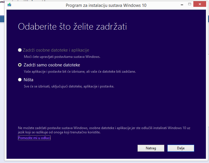 Evo da se i ja ubacim u ovu temu. Dali itko može objasniti ćemu imam samo dvije opcije za odabir...kkao kaže radi odabranog jezika,ali nigdje nisam imao opciju biranja jezika. ISkreno zelim upgejdati a da mi se ne brise nista za početak. Isao sam preko media toolkita. ovako to izgleda : |