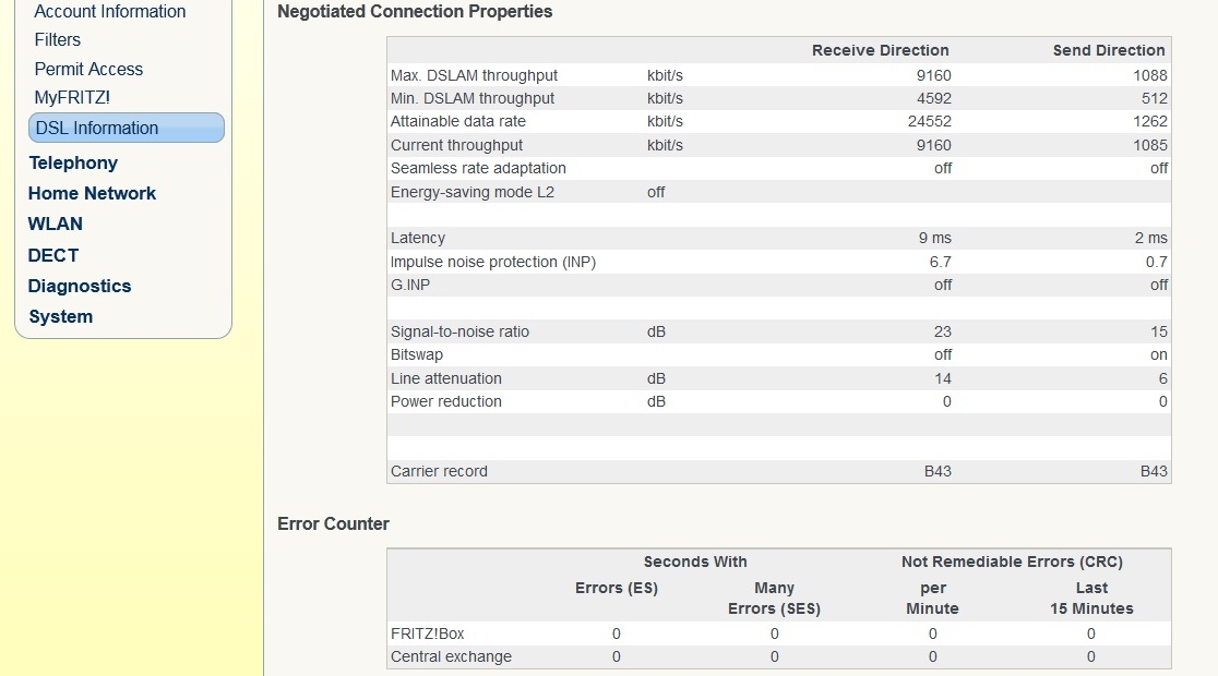 Link Status Connected Modulation Type ADSL_2plus Actual Rate (Up/Down) 1143/12529 kbps Attainable Rate (Up/Down) 1116/16976 kbps Noise Margin (Up/Down) 5.4/5.8 dB Line Attenuation (Up/Down) 14.8/30 dB Output Power (Up/Down) 13.3/18.4 dBm Data Path (Up/Down) Interleaved/Interleaved Interleave Depth (Up/Down) 4/192 Interleave Delay (Up/Down) 2/4 ms INP (Up/Down) 0.5/1.5 symbols Profile N/A LinkEncap G.992.3_Annex_K_ATM CRC Errors (Up/Down) 2/2988 FEC Errors (Up/Down) 223/4181182 HEC Errors (Up/Down) 1/28567 da li je normalno da bude ovoliko gresaka u jednom danu? |