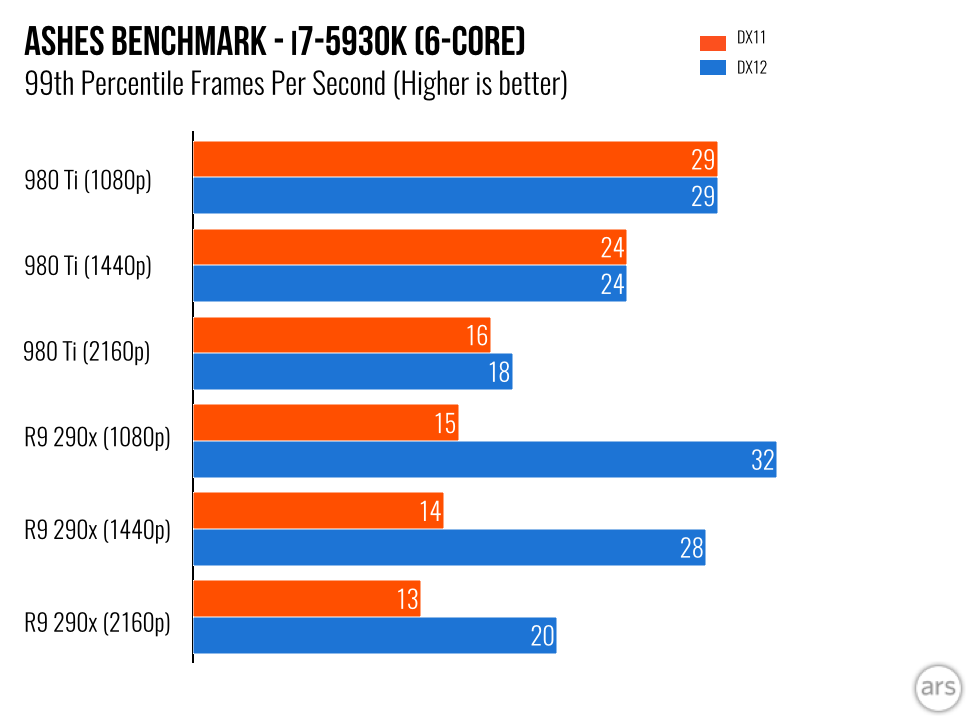 Recimo ovaj graf što je romano istaknio, treba malo i interpretirati rezultate, a ne samo gledati u brojke i uzeti zdravo za gotovo - baš se vidi da je igra benchmark i da nema veze sa životom. Gdje to 290X sa dx11 ima duplo lošije perfomanse od 980Ti? Pazite cpu je i7 5930K, dakle tu ne vrijedi priča o cpu bottlenecku i lošijim amd dx11 driverima u takvim situacijama. |