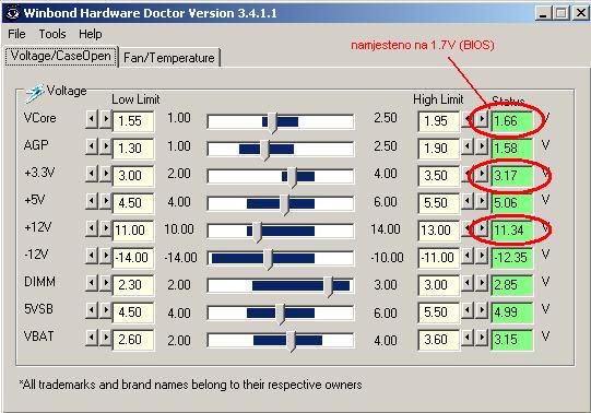 Kolko vidim tebi sve malo overvolta al to nije lose tolko, probaj izmjerit multimetrom napone al vjerojatno da je neki bolji primjerak napajanja jel meni je uzasan pad napona bio na istom takom napajanju pogotovo na 12V railu.