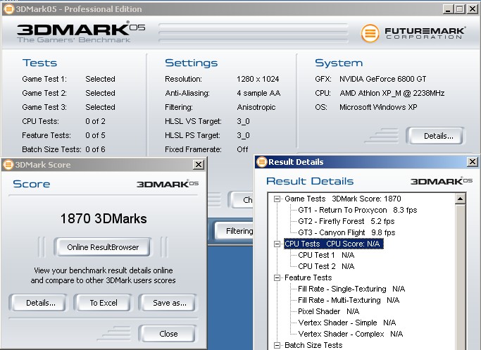 Naime kad ukljucim 4XAA i vise na rezi 1280x1024 prvi test 3DMarka 05 nece da starta i pojavi se error: Create Texture Failed: Out of video memory. Inace druga dva testa se odvrte. Na 1024X768 nema frke. Interesantno je da mi se PoP:Warrior Within rusi kad ukljucim AA. |