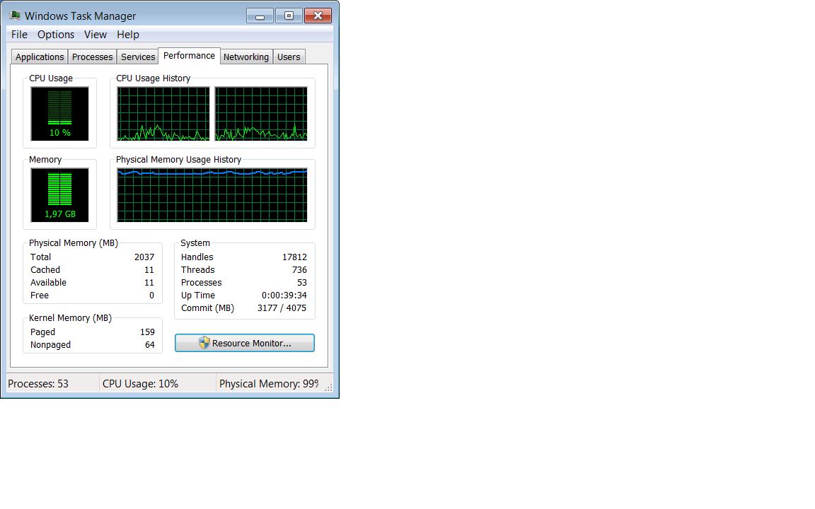 Pozdrav, Laptop Dell latitude d830 Kad ga upalim radi relativno dobro ali nakon 20-40 minuta tolko uspori da je nemoguće raditi. Ne radim nikakve zahtjevne stvari, samo surfanje, youtube i sl. Da bi ponovo mogao raditi moram ga restartati ali i to onda traje po 5 minuta (restart) pa opet sve isto malo radi pa zakoči. Sumnja je pala na memoriju (ima 2x1gb ). Poslije paljenja slikao sam u task manageru performance (slika1) te nakon što je uuuuusporio, mogli bi reći zaledio (slika2) Dali je moguće da su otišla oba dva modula ili se nešto drugo dešava. Hvala. |