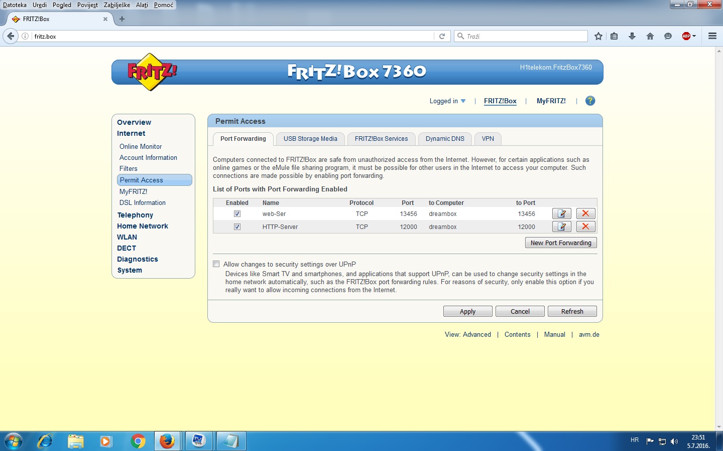 - upali UPnP pa možda sam otvori šta treba - jeli na dream - u fiksna ip adresa ? - isto tako jeli u fritzu pod dream navedena ta ista fiksna ip adresa ?  |