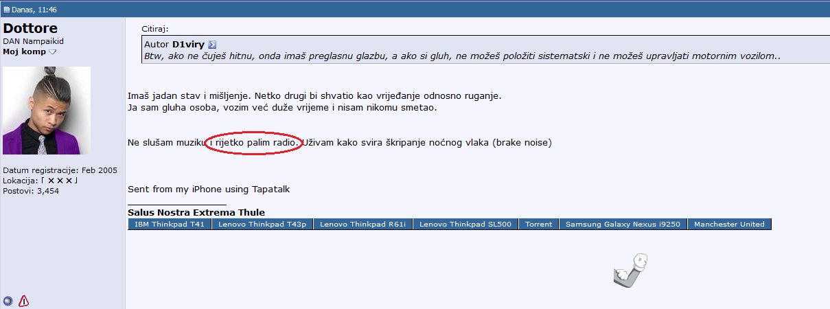 Imaš jadan stav i mišljenje. Netko drugi bi shvatio kao vrijeđanje odnosno ruganje. Ja sam gluha osoba, vozim već duže vrijeme i nisam nikomu smetao. Ne slušam muziku i rijetko palim radio. Uživam kako svira škripanje noćnog vlaka (brake noise) Sent from my iPhone using Tapatalk
