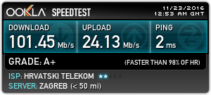 Download Speed: 10521 kbps (1315.1 KB/sec transfer rate) Upload Speed: 753 kbps (94.1 KB/sec transfer rate) Latency: 16 ms Jitter: 4 ms 15.11.2016. 19:40:46 I sad mi video u 1080p nesteka kad ga pustam na TVu...