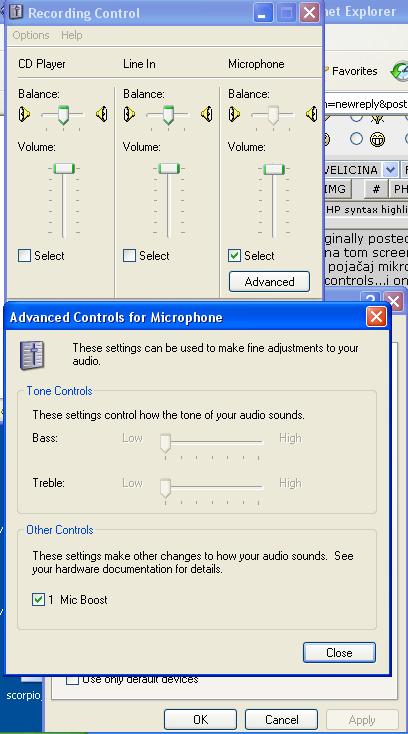 odi na volume properties i otvori advanced setting od mikrofona...stavi kvačići na boost microphone i pojačaj ga do kraja...i to bi trebalo biti to... |