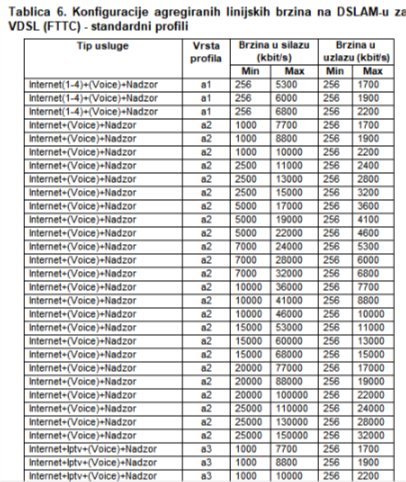 Ja sam naletio na još nešto zanimljivo. Znači u Javnoj raspravi - Odluka o izmjenama Standardne ponude Hrvatskog Telekoma d.d. za uslugu veleprodajnog širokopojasnog pristupa... Naletio sam na predloženo: Konfiguracije agregiranih linijskih brzina na DSLAM-u za VDSL (FTTC) - standardni profili... Profil za najveću brzinu: Internet+(Voice)+Nadzor a2 Min DL 25000 kbit/s Max DL 150000 kbit/s Min UP 256 kbit/s Max UP32000 kbit/s Što znači da u budućnosti HT bi mogao nuditi preko FTTC a internet + voip pakete sa brzinama od 100/20 Mbps ili cak 100/30 Mbps. Zanimljivo je da postoji u prijedlogu profil sa istim brzinama za inernet + voip + iptv. |