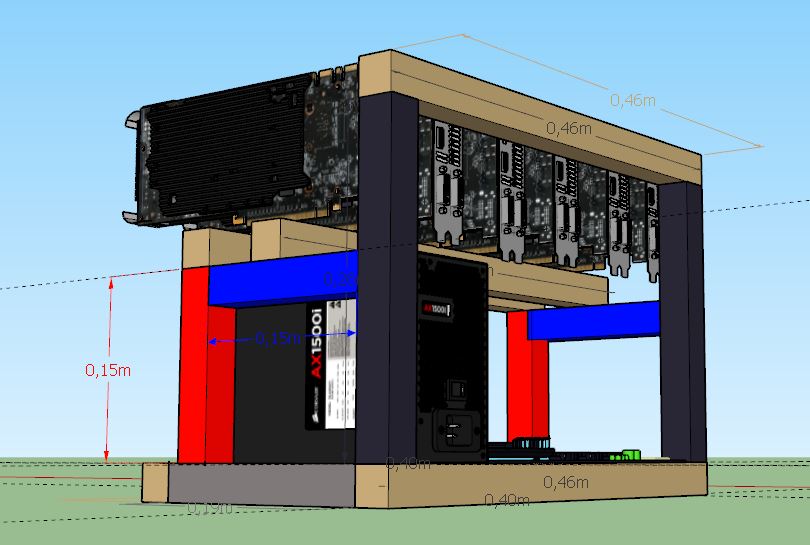 Izrađujem novi frame za 10-13 GPU-a i zatvaram ga u ormar. Hladni zrak bi dovodio kroz rupu s donje strane, a topli odvodio ventilatorom s gornje strane. Zbog toga sam grafičke zarotirao za 30°. Zanima me jesam li dobro okrenuo grafičke? Na internetu uglavnom vidim ventilator na prednjoj strani GPU-a. Meni se čini da sve kartice najviše toplog zraka izbacuju baš na prednju stranu, pa sam zato predvidio usis zraka sa stražnje strane (gdje su konektori) kartica. Zadnje izmijenjeno od: FRipper. 13.11.2017. u 10:20. |