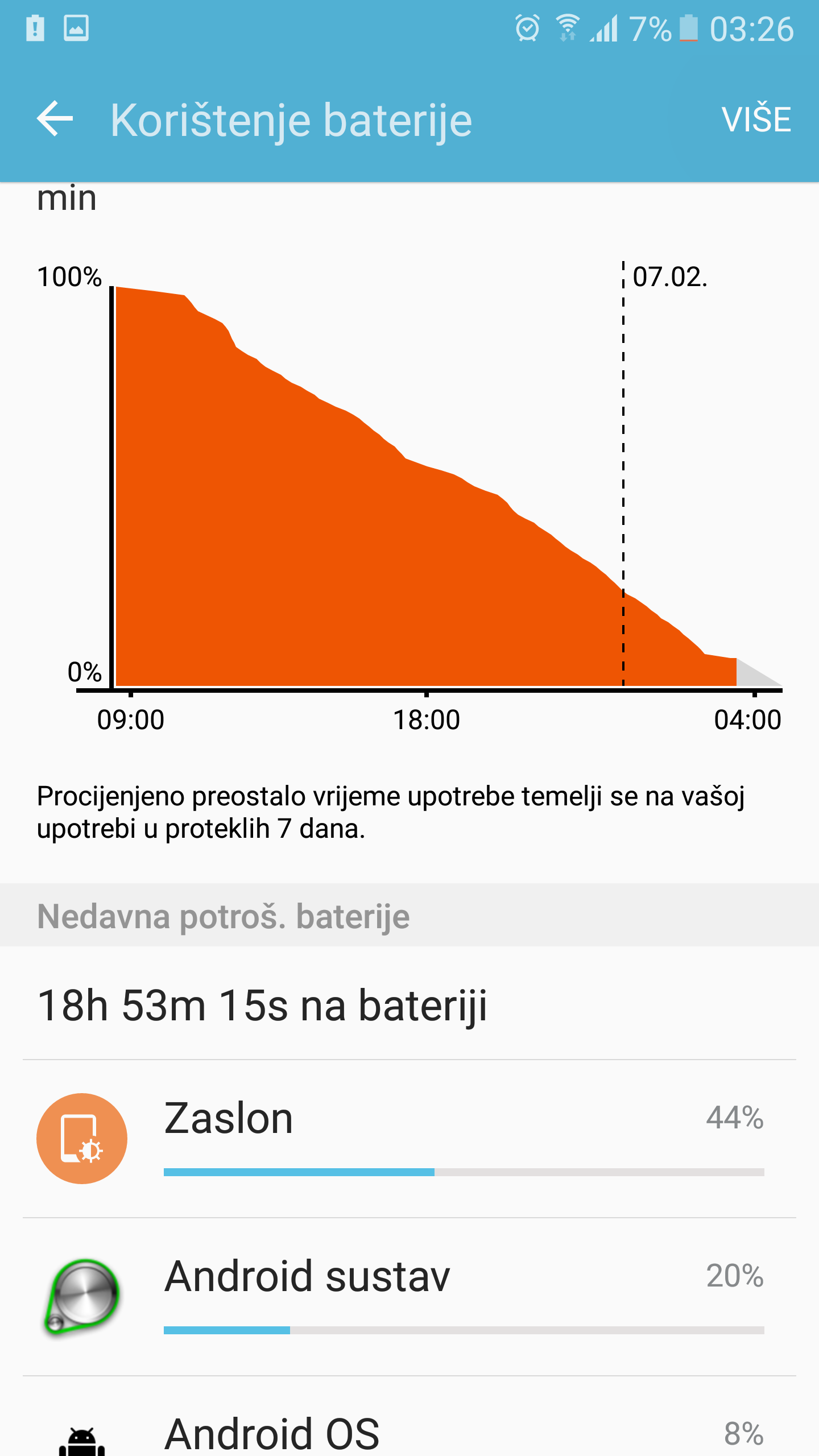 Taman danas na bolovanju, odlucio nakon 7mj formatirati S7icu i downgrejdati na predzadnji update (aug. patch). Jedini razlog je sto imam feeling da baterija malo krace traje a nis ne dobivam sa oct. patchem. I evo danas doma na wifiju, trenutno na 60% i 3.30h sot. Youtube, im, chrome i tapatalk, uvijek iste stvari koje koristim - ali ovaj put na wifiju! Nevjerojatno kolika je razlika kada mob koristis na losem 4G ili wifi signalu. Inace radnim danom mi sot u pravilu bude 2.30-3h za prvih 50% na losem 4g. Mozda bi mogao fleshati samo stariji modem, dunno. Ugl, ne diram nista, nema smisla.