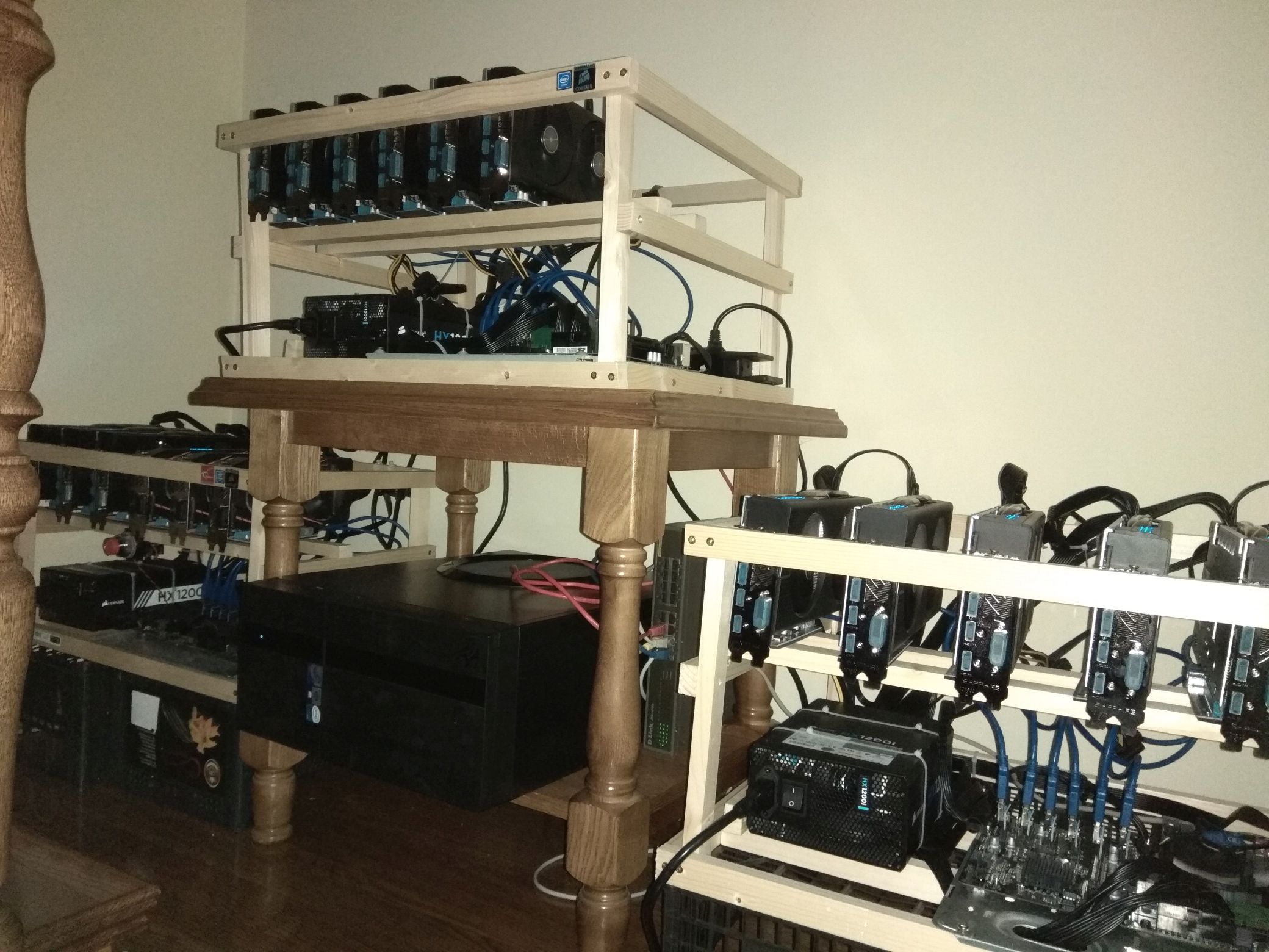Hajde da sudjelujem sa svojim rigovima... Rig1: Matična ploča ASRock H81 Pro BTC, s1150, ATX Procesor Intel Pentium G3260 (Dual Core, 3.3 GHz, 3 MB, LGA 1150) box Grafička kartica AMD Sapphire Radeon RX 580 Nitro+, 4GB GDDR5, Lite 3x Grafička kartica AMD Gigabyte Radeon RX 580 Gaming, 4GB GDDR5 3x Napajanje 1200W Corsair HX1200, HX Series, Fully Modular, 80+ Platinum, CP-9020140-EU Memorija G.Skill 4 GB DDR3 1600MHz, F3-1600C11S-4GNS Potrošnja struje = ~650W Gigabyte RX580 Modani Biosi Core Clock : 1150 Memory Clock 2100 Voltage: 0.85 Electroneum Hash rates: 880 878 879 Sapphire RX580 Modani Biosi Core Clock : 1200 Memory Clock 2050 Voltage: 0.9 Electroneum Hash rates: 896 897 896 Rig2: Matična ploča ASRock H81 Pro BTC, s1150, ATX Procesor Intel Celeron G1840 (Dual Core, 2.8 GHz, 2 MB, LGA 1150) box Grafička kartica AMD Sapphire Radeon RX 580 Nitro+, 4GB GDDR5, Lite 6x Napajanje 1200W Corsair Professional Platinum Series HX1200i Memorija Kingston 4 GB DDR3 1600MHz, KVR16N11S8/4 Potrošnja struje = ~650W Sapphire RX580 Modani Biosi Core Clock : 1200 Memory Clock 2050 Voltage: 0.9 Electroneum Hash rates: 915 913 915 915 915 912 Rig3: Procesor Intel Celeron G3930 (Dual Core, 2.9 GHz, 2 MB, LGA 1151) Matična ploča Gigabyte GA-H110-D3A Mining Ready, s1151 Procesor Intel Celeron G1840 (Dual Core, 2.8 GHz, 2 MB, LGA 1150) box Grafička kartica AMD Sapphire Radeon RX 580 Pulse OC Lite, 4GB 6x Napajanje 1200W Corsair Professional Platinum Series HX1200i Memorija Crucial 4 GB DDR4 2400MHz, CT4G4DFS824A Potrošnja struje = ~650W Sapphire RX580 Modani Biosi Core Clock : 1180 Memory Clock 2020 Voltage: 0.9 Electroneum Hash rates: 898 896 892 898 893 892 Svi rigovi na ETH imaju hash rate oko 30-31 MH/s po kartici, i vuku oko 800-900W po rigu. Frame je očigledno od drveta, ručni rad, letvice kupljene u Pevecu. Od dodatne opreme tu je Uticnica mFi MPower za nadzor potrošnje. |