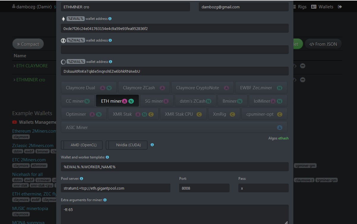 A zašto ti je claymore.... Klikneš na rig, s lijeve strane pod Wallet odabereš s padajuće liste ETHminer, s desne strane pod wallet iz padajućeg izbornika odabereš taj wallet u kojem ti je config za ethminer podešen i stisneš raketu na sredini. U istom walletu možeš imati confige za claymore i za ethminer.