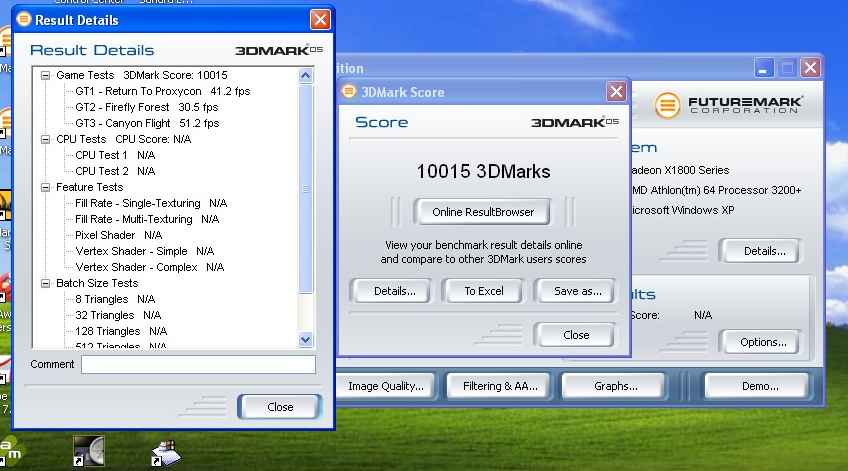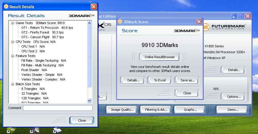 Nvidia Geforce 6600 GT Leadtek Agp @570 Mhz/1.05Ghz Windows xp pro SP 2 Nvidia forceware 81.85(Antialiasing i anisotropic filtering=Application controled,Image settings=High performance,V.Sync=On,Force mipmaps=Trilinear,Triple Buffering=On,Anisotropic mip filter optimisation i Anisotropic sample optimisation=On,Trilinear optimisation=Off) 3d Mark 05 default 1024x768:3222 boda http://img357.imageshack.us/img357/9052/3dmark052op.jpg |