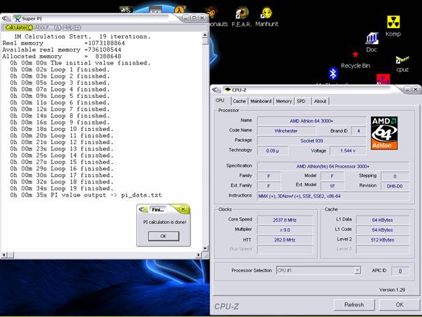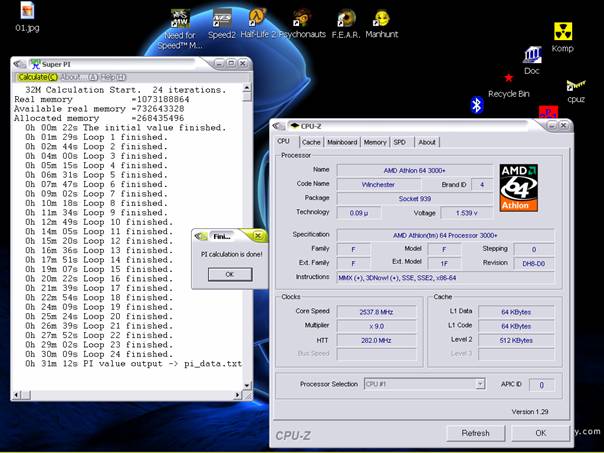 probao sam i vishe ide fsb i na 290 mada nestabilno brijem kochi me plocha i mema a mozhda i napajanje voltazha na procu je 1,55V - chipset na 1.7 - mema na 2.8 Memu sam skinuo na 166 (333)@2.5-3-3-5 Evo i super pi 1M