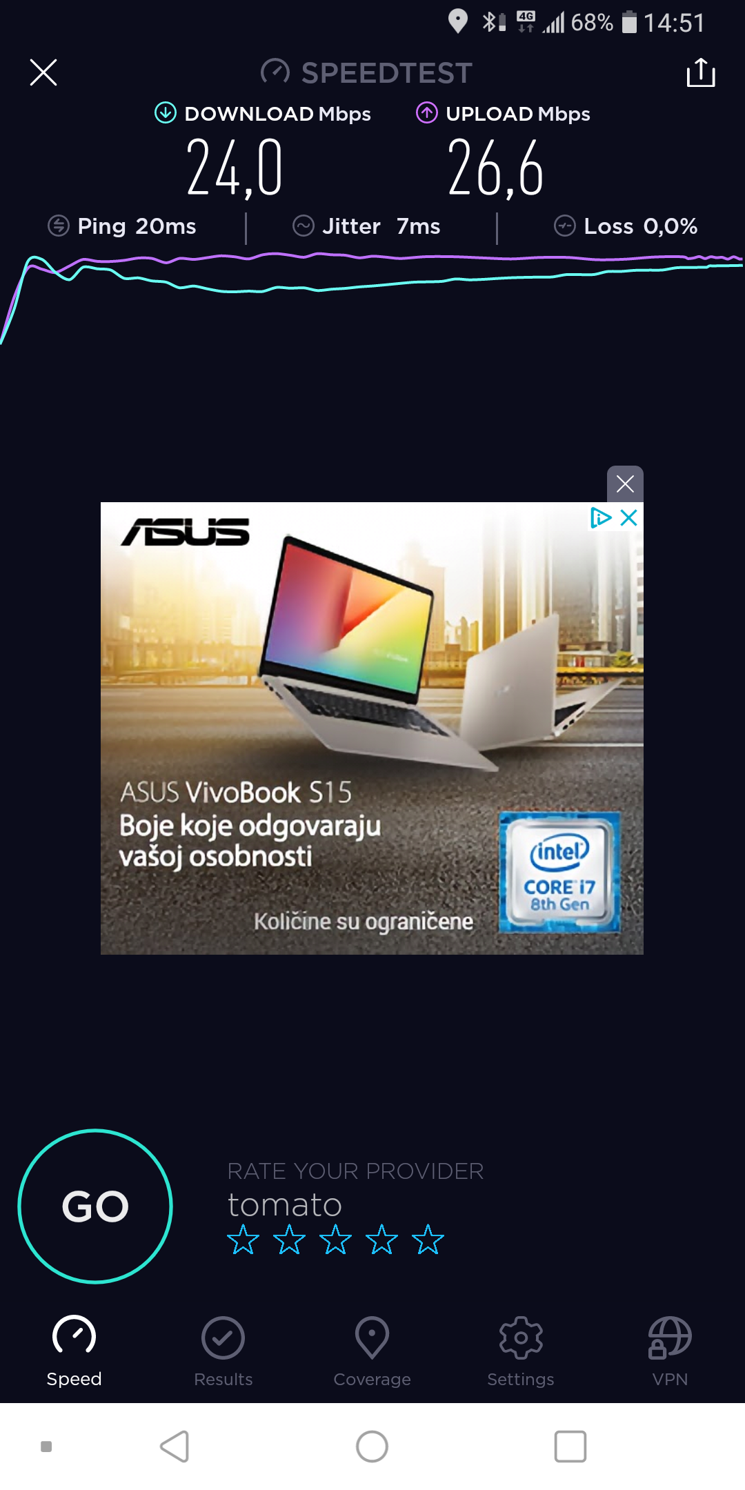 Wifijem na laptopu ide do 50/10 a Nexbox A95x iza 2 vrata u sobi se drži na 15/5
