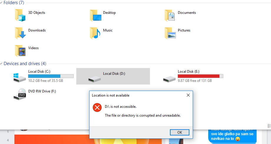 ..valjda je početak bio desni klik na D: disk u exploreru , pa properties > tools >"Check".