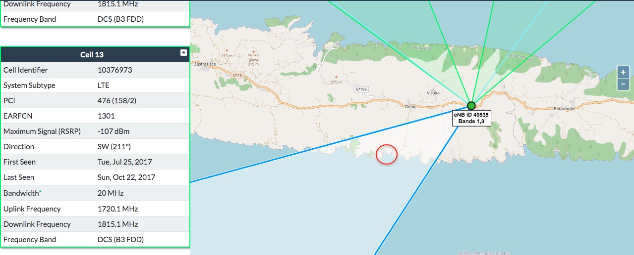 Na slici u crvenom krugu je pozicija moje kuće, a ovo je odašiljač od TELE2 koji baš pokriva taj smjer. Ali ja imam telefon od TELE2 i signal je stabilan i jak tek kad se udaljim čamcem od obale izvan uvale. Usjeci su duboki i izgleda da je kuća u sjeni tog signala. Pitanje je, da li možda mogu nekako "upecati" signal ako vanjske MIMO antene usmjerim prema vrhu brda u smjeru odašiljača, ili to tako ne funkcionira?" |