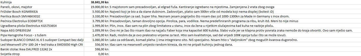 To je bio moj gušt.Al teško je ako si sam ne radiš ići na ispod 25-30k kn. Da sam uzeo najjeftinije aparate, uštedio bi 10k sigurno na ovih 40k. IKEA je dobra ako imaš ravan zid. Neke stvari nema šanse da bi uspio složiti u ikei kako sad imam. A da ne govorim kakve akrobacije je majstor radio gdje su priključci plina, vode. Hvala, platim da mi naprave i to je to. Za to vrijeme zaradim lovu u onome u čemu sam ja dobar i bok. Za neke stvari je bolje platiti.