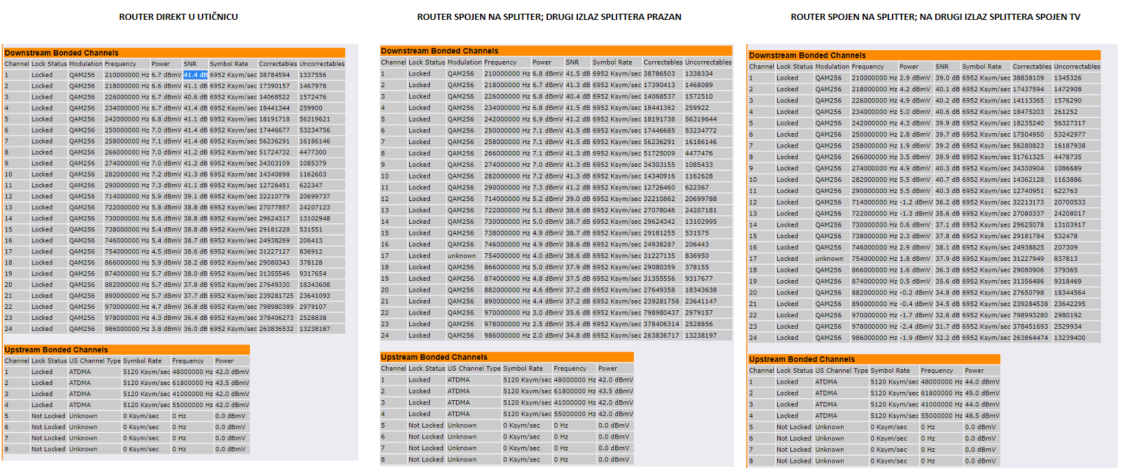 Slažem se s Nikkyjem, tu je problem krivi splitter. Inače ti je razina signala prilično dobra (gleda se SNR i Power kod downstreama i Power kod upstreama), ali nešto ti uzrokuje ogromne količine grešaka (correctables i uncorrectables) i to je skoro sigurno taj splitter, trebaju ti F-konektori. |