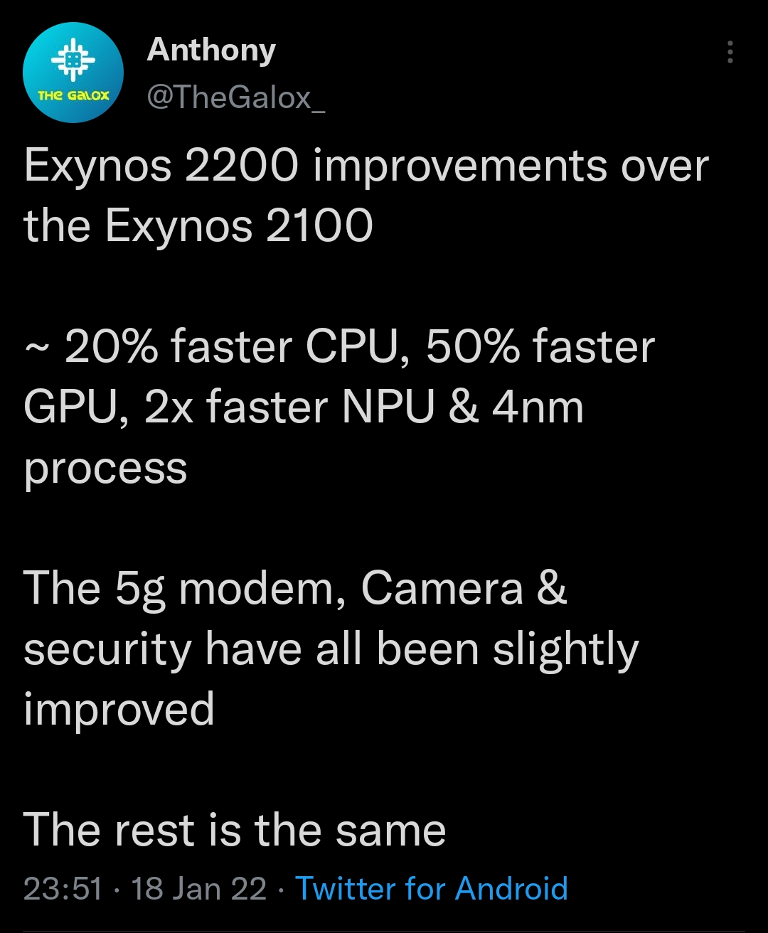 S21 FE na ovom tržištu ima SD, a za S22 se predviđa da će, kao i prije, imati Exy 2200. EDIT: evo malo friških glasina o S22 seriji https://www.xda-developers.com/galax...pecifications/