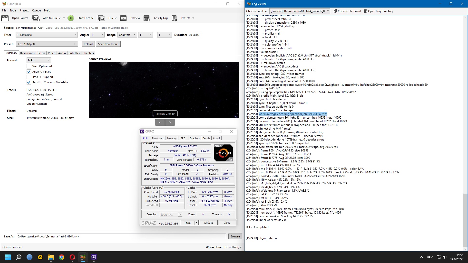 Kad je kolega bumpao ovaj stari thread, odlučio sam i ja odvrtiti Handbrake na svom 5600x ![]() Ryzen R5 5600X @ PBO + Auto OC / DDR4 @ 3733Mhz - Avg FPS = 98.839 FPS Samo za usporedbu, grafa (3060ti) to odradi dosta brže naravno - Avg FPS = 205.609 FPS Zadnje izmijenjeno od: Sn4k3. 14.08.2022. u 17:18. |