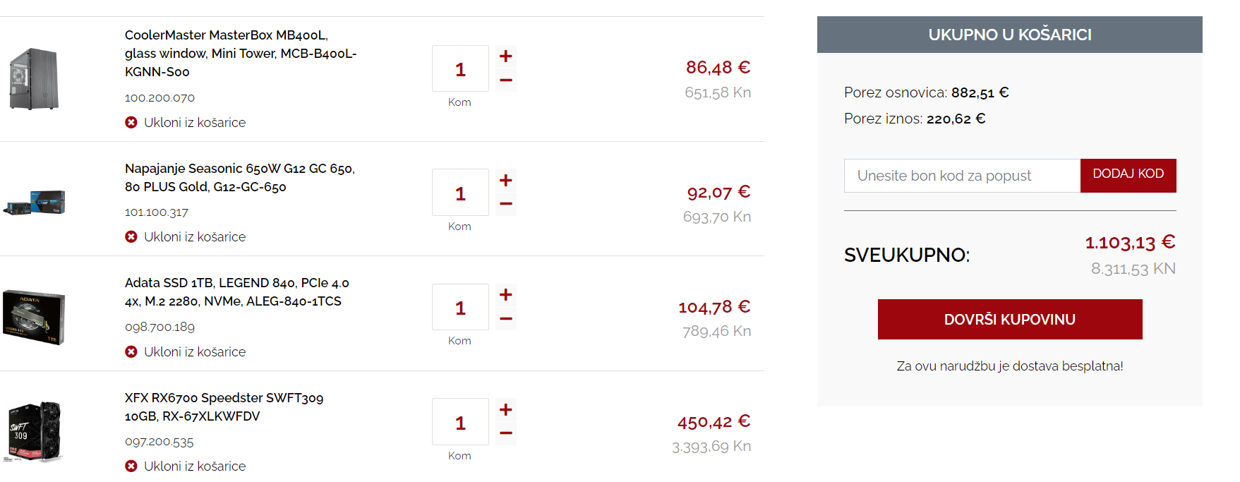 Majstori, jel ovo ok konfiguracija? Ima li nešto od komponenti da je bolji omjer cijene/kvalitete? Možda bih se protegnuo do RX6800. Kućiste imam. Čitao sam temu, ali totalno sam ispao iz đira za komponente pa molim vašu pomoć. Tnx! Gigabyte RX6700XT EAGLE GDDR6 12GB/192bit, PCI-E 4.0 x16, GV-R67XTEAGLE-12GDCPU AMD Ryzen 5 5600 BOX, AM4, 100-100000927BOX ASUS Prime B450M-K II, AM4, AMD B450, 90MB1600-M0EAY0 DDR4 16GB (2x8) Corsair 3600MHz LPX Black, CMK16GX4M2D3600C18 Samsung SSD 1TB 980 M.2, PCIe 3.0 x4, MZ-V8V1T0BW, 600TBW Napajanje Seasonic 650W G12 GC 650, 80 PLUS Gold, G12-GC-650 ![]() |