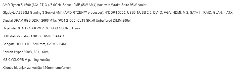 ovo je bila preporuka: 1 * CPU AMD Ryzen 5 5500 100-100000457BOX Šifra: 0001258709 1 * ID-Cooling CPU Cooler - SE-223 BASIC Šifra: COLIDCSE223BASIC 1 * GIGABYTE Main Board Desktop B450M GAMING Šifra: B450M_GAMING 1 * Memorija PC-28800, 16 GB, ADATA XPG D30 Black Edition, AX4U36008G18A-DB30, DDR4 3600Mhz, 2x8GB AX4U36008G18A-DB30 Šifra: 010.504.013 Sveukupno s popustom: 2.541,40 Kn Nažalost malo zabrazdio pa nisam ništa uzimao, dali se nešto promijenilo ili ova preporuka i dalje vrijedi? (nadam se po sličnim cijenama )![]() |