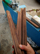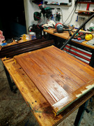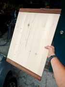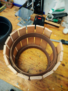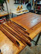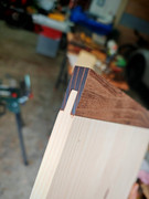 Malo nastavka radova... Jučer se zafrkavao s nekim otpadom od ko zna čega (mislim mahagonij i/li sapele) i hrast pa odlučih napraviti daske za rezanje. Ovu na trake poklonio frendu, ova druga od termo bora i mahagonija mi nije baš reprezentativna jer sam malo zafrkao prilikom ljepljenja, a kit je ispao dosta svjetliji tako da ne znam šta ću s tim još iako je funkcionalna ![]() Danas napokon stigao na red i dugo otegnuti poslić rekonstrukcije/repliciranja stolića iz Jyska. Radi se o stoliću koji je bio ekstra jeftin i ploča je od mdf-a s papirnatom folijom koja se nakon malo korištenja izraubala pogotovo na kutevima. Noge su puno drvo dok je gornja polovica nogu obojana u bijelo i šarafe se u metalne ploče. Nešto slično ovome: ![]() Opet od nekog otpada napravih u grubo letvice koje sam samo debljačom doveo do iste debljine (čela koja se susreću) dok sam visine ostavio neravnomjerne jer je određen broj letvica bio kriv i svakakav tako da bi ravnanje na stolnoj pili bilo naporno i uzelo previše vremena. Pošto se radi o promjeru od 32cm te prolazi kroz debljaču iskoristio sam je i u desetak laganih prolaza doveo iz čušpajza u respektabilnu površinu ![]() Kasnije otpilao višak i na stolu glodalicom popratio po staroj ploči stola te koristeći 45° bit malo formirao donji obod i sa R3 rubnim bitom skinuo oštri rub na gornjem dijelu. Sve to premazao firnisom i sutra ću navjerojatnije Hempel Dura satin lakom u 2-3 ruke. ![]() Edit: Gotovo! ![]()