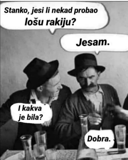nisi brt, nisam ni ja vjerovao dok nisam probao (uvijek sam mislio da je rakija "prejaka", ali nije).. samo šljiva od rakije (ili šta voliš od rakije, travarica ovo ono) i ko bog si tu večer, i sutra ujutro.. samo ne kombinovat s pivom, ili ičim drugim.. mislim možeš dakako, ali tad ide kaos i nisi fin ne samo sebi nego i drugima! OT - nemam ot, izvinite admini, moralo se, znam da ćete razumit, i vi pijete ili ne bi bili pc ekspert admini da trpite sve ove napise na forumu (što trezan misli, pijam kaže), kad kombinuješ.. a rijetko valja |