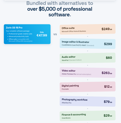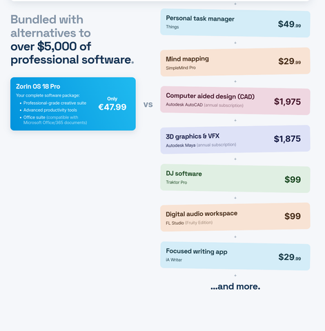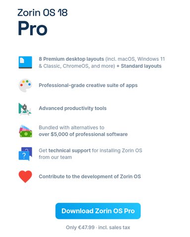 Zaboravio si i jedan mali detalj - 48 eura kosta samo aktualna verzija. Sljedeci major upgrade moras platiti novi iznos. Nisam nasao koliko obnova kosta, pisalo je na sajtu da postojeci platise dobiju neki popust. Tako da je taj Pro zapravo vise kao preplata, a ne single purchase. https://help.zorin.com/docs/purchasi...-zorin-os-pro/