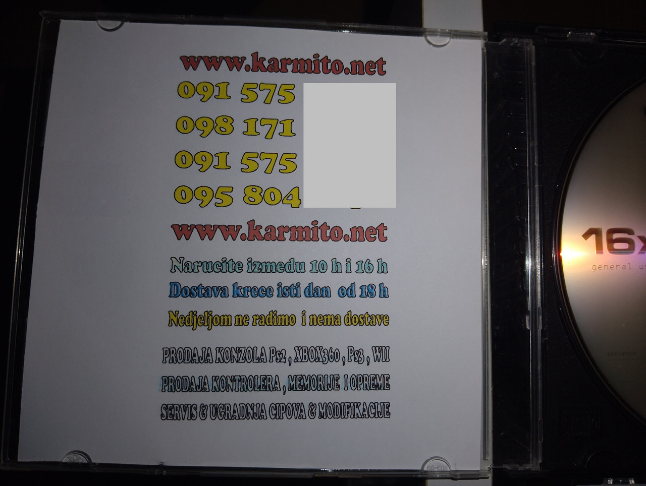 Vezano uz pirate i Karmito kojeg sam prije spomenuo, evo i fotka jednog od više preživjela DVDa iz druge polovice 2000ih. ![]() Telefone sam cenzurirao za svaki slučaj (možda su opet aktivni?) a web stranicu ostavio jer ionako više ne postoji. Profesionalna "firma" sa kojom nije bilo problema, jedino im je dostava bila čudna. Rekli su da čovjek bude došao sa vrećicom na adresu i da se budemo našli ispred zgrade, na parkiralištu. Ali mi nisu dali tablicu ili marku auta, zbog čega sam čekao dolje dobrih 10ak minuta kao budala i prišao jednom tipu sa otvorenim prozorom, pitajući ga "jeste li vi donijeli softver?" Ovaj me zbunjeno pogledao i odgovorio da mu nije jasno o čemu pričam, a mene uhvatila panika. Ništa sumnjivog, samo još jedan normalan dan u ZG... ![]() |