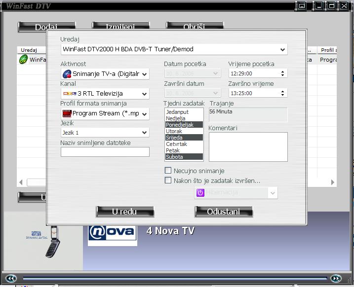 KHm....vi pricate o dva razlicita softvera ovdje....jedan (za analogne kartice) je Winfast PVR i on je trenutno u verziji 3.0.10.73 ili nesto slicno, a drugi (za digitalne i hibridne kartice, poput DTV2000H) je Winfast DTV i on je trenutno u verziji 2.0.1.86. E, sto se tice problema odabira dana samo klik na dane koje zelis da ti radi schedule i to je to ....screenshot prilozen: |