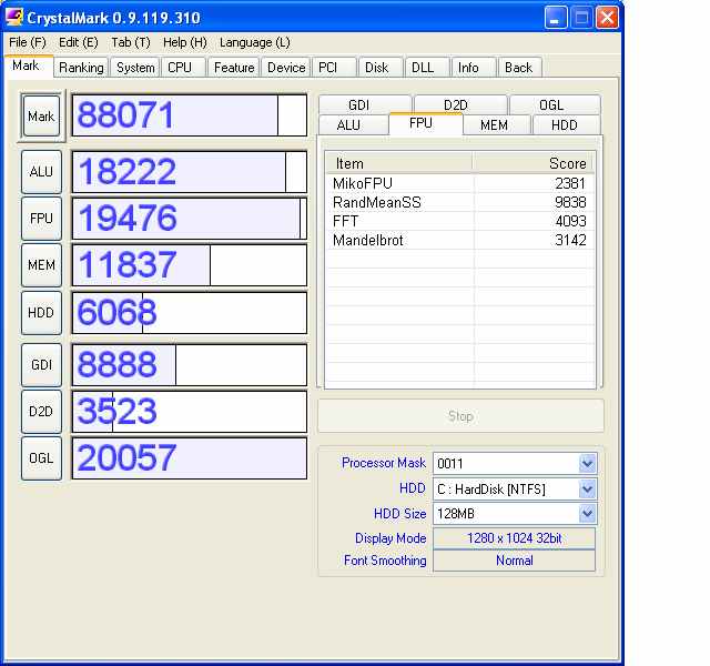 programcic mjeri svasta CPU (FPU, ALU), mem , GPU...itd .. i daje svaki rezultat posebno i ukupan rezultat odredjeni brojmarkova. Pa evo kome se mjeri , za download: http://crystalmark.info/download/index-e.html program nema instalacije, treba pokrenut CrystalMark09.exe i pritosnut gumbić "mark" skroz gornji lijevo. Pricekat i to je to ![]()