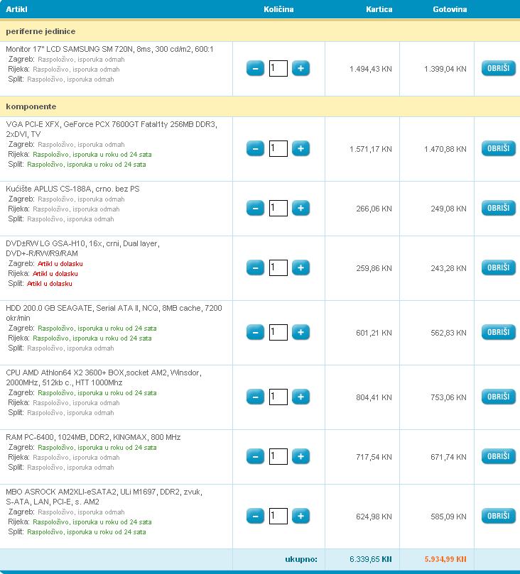 Evo ovako nešto: ![]() + grafa X1900GT AIW oko 1500kn + kučište po tvom izboru do 300kn = oko 6300kn, stavio sam ti optikanera jednog nisam znao da li ti treba, ako ne onda ti to ispadne ravno oko 6000-6100kn! Iako bi mogo proći dosta jeftinije da kupuješ po različitim dućanima, ali pošto je jedan od tvojih kriterija sve iz jednog dućana... onda ništa... |