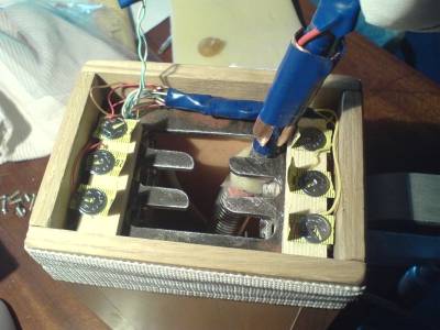 To mi je bio najveći problem. Ovo je četvrti! način na koji sam to radio, prvo sam počeo sa malim tasterima, ali mi ih je bio jako velik problem točno namjestit, a i kad sam ih stavio da rade pritisnuli bi se samo jedan put, a ne bi stalno stali pritisnuti. Drugi i treći pokušaj su isto bili promašaj, i onda sam, kao što se vidi na slici, stavio kaomadiće starog metra, izbrusio ih sa unutarnje strane, a na polugu stavio komad bakrene cijevi. Kad se ubaci u brzinu metalni djelići se lagano napnu, i to stalno stoji u kontaktu. I nema opasnosti da se trajno iskrive u neki položaj pa da nakon nekog vremena ne bude kontakta, sve je to poprilično elastično. I da, radi bez greške! |