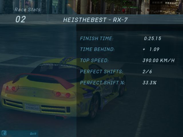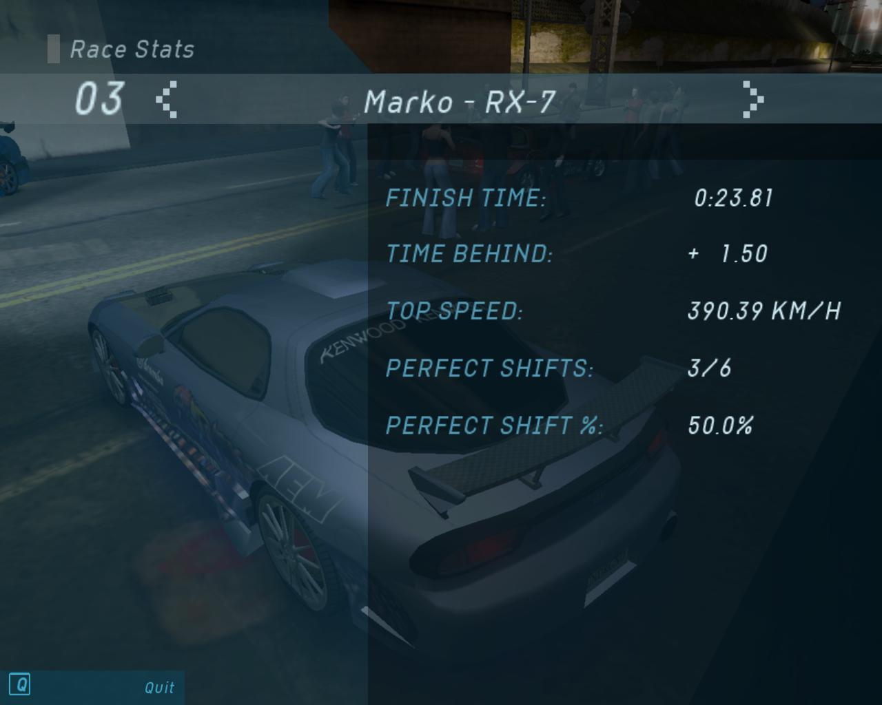 Eto ovdje mi nije riko motor ali sam išao 389.5km/h (SLIKA DOLJE) Imam još jedno destetak gdje sam išao 389 i 388 kmph Kako sam uspio? Pa kad sam prošao igru load-ao sam neki predzadnji save game tako da mogu uci "go underground" i promjeniti auto "trade in" promjenio sam nisan skayline u mazdu rx7 jer sam čuo da je najbža. Tako da su mi se svi unique prebacili na mazdu. Na startu sam dozvolio dam me ostali malo prestignu i onda sam ja hvatao njihov "falši zrak" (nema otpora zraka) . tako da sam ja bez nitra vrlo brzo došao do 330, 340KMPH ostatak je napravio NO2!! Mislim da brže ne može od 390 jer sam je pržio negdje sec do dvije na 390 s nitrom i nije htjelo više!!