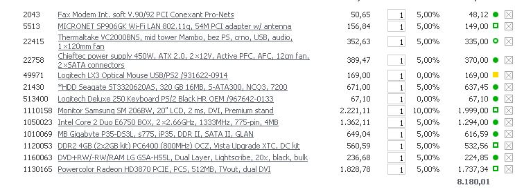 Evo,ovo je konačno skoro. Što mislite da bi se dalo zmaijeniti ili uzeti bolje i po mogućnosti za manje novce? Power Supply FORTRON 400W, HQ, PFC, 2 x 12V, 12cm fan 291,00 MICRONET SP906GK Wi-Fi LAN 802.11g, 54M PCI adapter w/ antenna 149,00 Thermaltake VB6000BWS mid tower Swing, bez PS, crno, USB, Fire wire, 509,00 HDD Seagate ST3320620AS, 320 GB 16MB, S-ATA300, NCQ3, 7200 671,00 Logitech RX1000 Laserski miš USB OEM /931710-0600 159,00 Logitech Deluxe 250 Keyboard PS/2 Black HR OEM /967642-0133 67,10 MB Gigabyte P35-DS3P, s775, iP35, DDR II, SATA II, RAID, FW, GLAN 875,05 Intel Core 2 Duo E6750 BOX, 2×2.66GHz, 1333MHz, 775-pin, 4MB 1.294,00 Monitor Samsung SM 2032BW, 20" LCD, 2 ms, DVI, sjajno crni 1.899,00 DDR2 4GB (2x2GB kit) PC6400 (800MHz) OCZ, Vista Upgrade XTC, DC kit 532,56 DVD+RW/-RW/RAM LG GSA-H55L, Dual Layer, Lightscribe, 20x, black, bulk 224,85 Powercolor Radeon HD3870 PCIE, PCS, 512MB, TVout, dual DVI 1.737,34 |