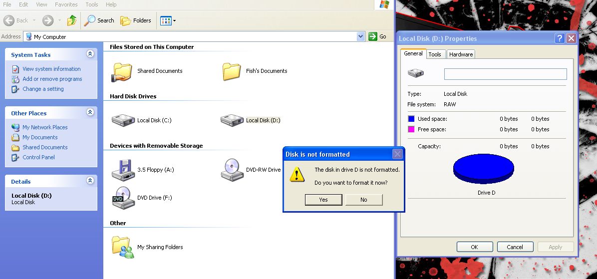 Dakle ovako imam Seagate 160 gb sata disk podjeljen na 2ije particije C (cca 10 gb) i D (cca 150 gb), na C su mi samo programi i win, a na D sve ostalo Gledo sam film (koji je bio na D) i samo odjednom mi se komp restarto, i nemogu vise otici na D particiju (kaze: the disk in drive D is not formated, would you like to format now?) i cita ga ko 0 od 0 gb Zna neko u cemu je problem i zas nezeli ocitat ? jer ono fakat svaki fajl koji imam mi je na D a bio je skoro pun, imam nekih relativno vaznih stvari gore i naravno da nemam backup jer sam mudar... ![]() |