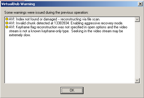 probao sam i scanirat video file u potrazi za bad framovima, nasao ih je... izbrisao sam ih, al opet ista greska , pokrenem opet taj bad frame search pa mi nade bad framove na drugom mjestu, a nekad ih ne nade... fileovi su capturani s tvtunera drito u Xvid, ali stariju verziju od ove s kojom pokusavam rekompresirati... neki filovi mi se normalno obrade... imam virtual dub mode 1.5.10.1 mozda koji program za popravit video file, probao sam vec asf, wmw repair (il kak se vec zove), te Video Repair... nista.. HELP ThnX Ovako, imam video fileove koje moram rekompresirati s nekim filterima, 2passom. e sad, virtualdub mi neke rekompresira uspjesno a u nekima mi javi gresku... SLika prilozena... probao sam stavit pod video --> error mode sve ponudene opcije, isto tako i za zvuk,