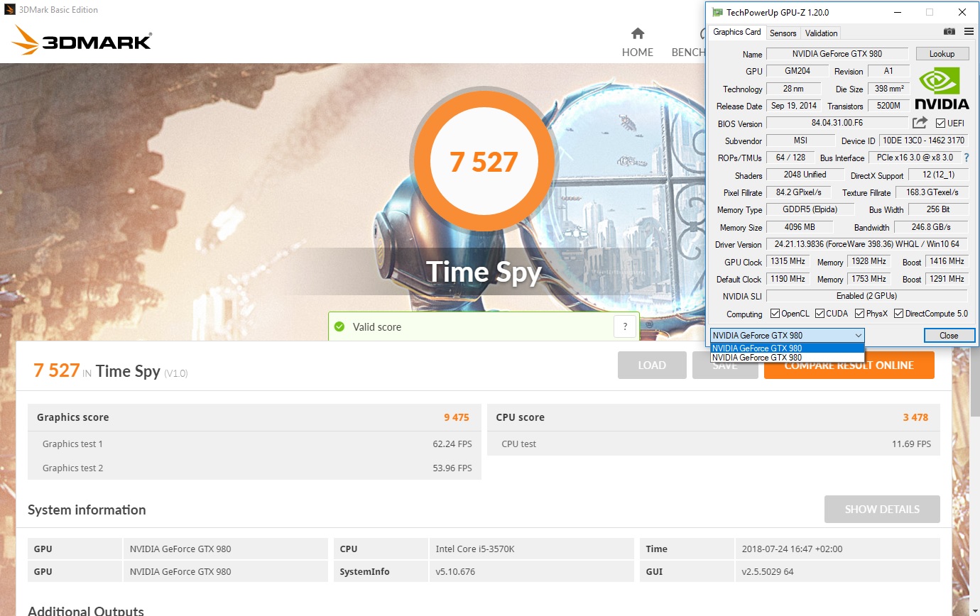 Uspio upariti 2 iste MSI Gaming GTX980 u SLI pa ako nekoga interesira score u sintetici (3DMark SkyDiver, Firestrike, TimeSpy)... Jest da je sa za današnje pojmove slabašnim i5 3570K na 4.5GHz, ali ionako mi je više nego dovoljan za moje potrebe