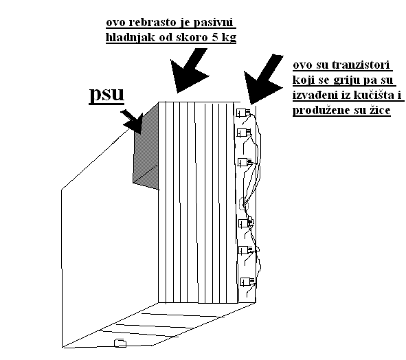 kad su već rasprave o tišini psu -a imam fortrona 350w pnf pa sam napravio mali mod i napajanje je postalo pasivno hlađeno. nemam fotić da poslikam ali sam malo crtao u pajntu |