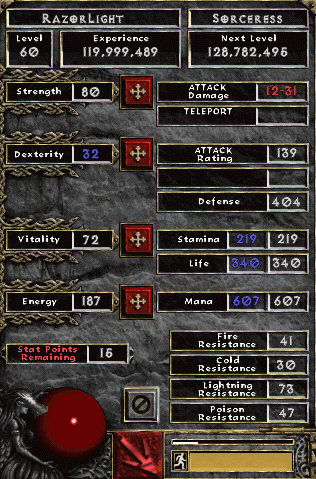 Znači Magic Find ![]() to ti je ona sa "XY% better chance of finding magical items" Blade igraš bez bodova u Vitality pa kako ne pogineš svako malo ?! mislim postoji fora da igraš na energy shield pa ti se ne oduzima health nego mana, al to u 1.10 baš i nije neka solucija...Moja mala sorca ganja strenght tek toliko da može nositi opremu, dex da ima 50% chance to block, a ostalo ide u health i energy...