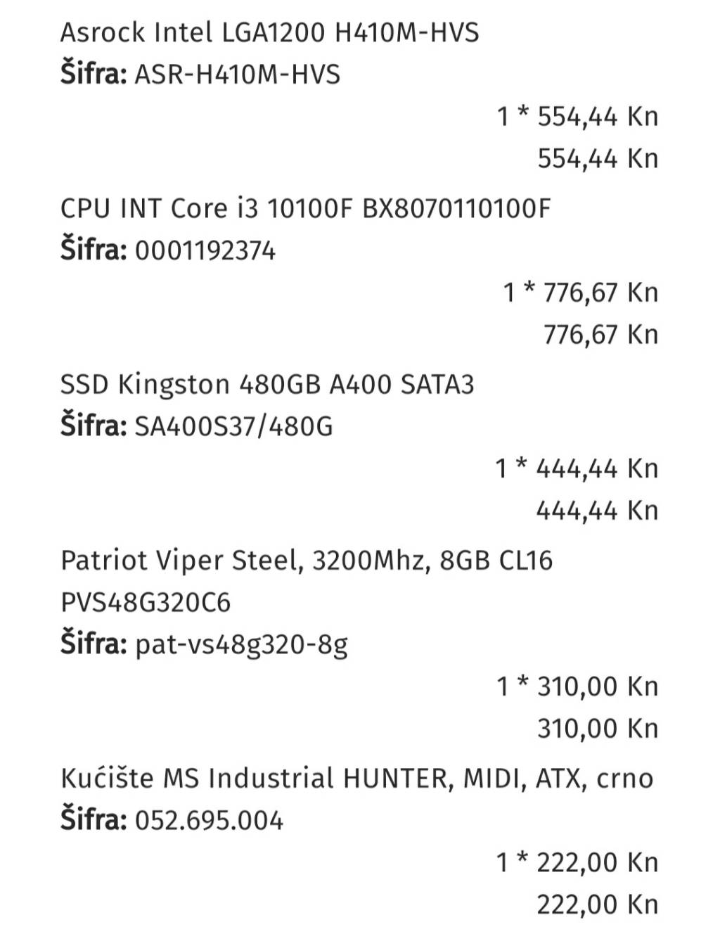 🙈 Na svakom forumu ista stvar. I sad kako da neznalica kao ja složi komp? 😂 Na kraju ga i necu kupit Evo da ponovim. Prvi dio je u košarici, a drugi dio se tek sutra može ubacit 1 * Patriot Viper Steel, 3200Mhz, 8GB CL16 PVS48G320C6 Šifra: pat-vs48g320-8g - 310,00 Kn 1 * Kućište MS Industrial HUNTER, MIDI, ATX, crno Šifra: 052.695.004 - 222,00 Kn 1 * INTEL Core i3-10100F 3.6GHz LGA1200 6M Cache Boxed BX8070110100F S RH8U Šifra: INT-0725 - 749,00 Kn 1 * Asrock Intel LGA1200 H410M-HVS Šifra: ASR-H410M-HVS - 554,44 Kn Sveukupno:*1.835,44 Kn https://www.futura-it.hr/black-frida...32420/product/ https://www.futura-it.hr/black-frida...32409/product/ https://www.futura-it.hr/black-frida...32272/product/ https://www.futura-it.hr/black-frida...32320/product/ 4832kn finito A ovo su rezervne opcije grafičke ako neko bude brži: https://www.futura-it.hr/black-frida...32410/product/ https://www.futura-it.hr/black-frida...32408/product/ Zadnje izmijenjeno od: android-split. 26.11.2020. u 18:17. |