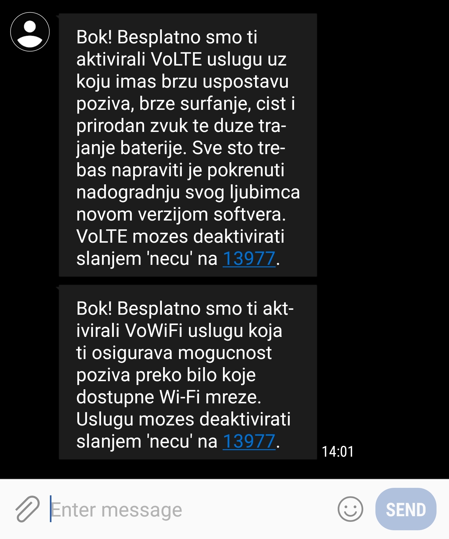 Ne znam da li je ovo dostupno kod ostalih operatera, al čini se da se BonBon modernizirao i aktivirao VoLTE i VoWiFi usluge. ![]() Danas stigla poruka o besplatnoj aktivaciji usluga, ali nažalost još nisam stigao isprobati koliko je kvaliteta razgovora bolja u odnosu na "normalnu" metodu razgovora. |