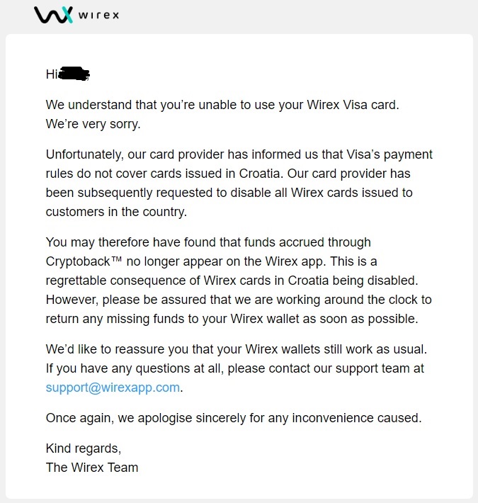 Upravo dobio mail. "We’re happy to confirm that all restrictions on Wirex Visa cards issued in Croatia have been lifted! We’ve worked around the clock with our card provider to solve the issue, and we’re delighted that we are able to issue cards - and offer the full Wirex service - to our Croatian users once again. This includes the crypto and traditional currency wallets, the Wirex Visa payment card and features like CryptobackTM. Thanks for your patience. We’re sincerely sorry for any inconvenience caused. If you’re still experiencing any problems, please contact our support team at support@wirexapp.com. Kind regards, The Wirex Team" |