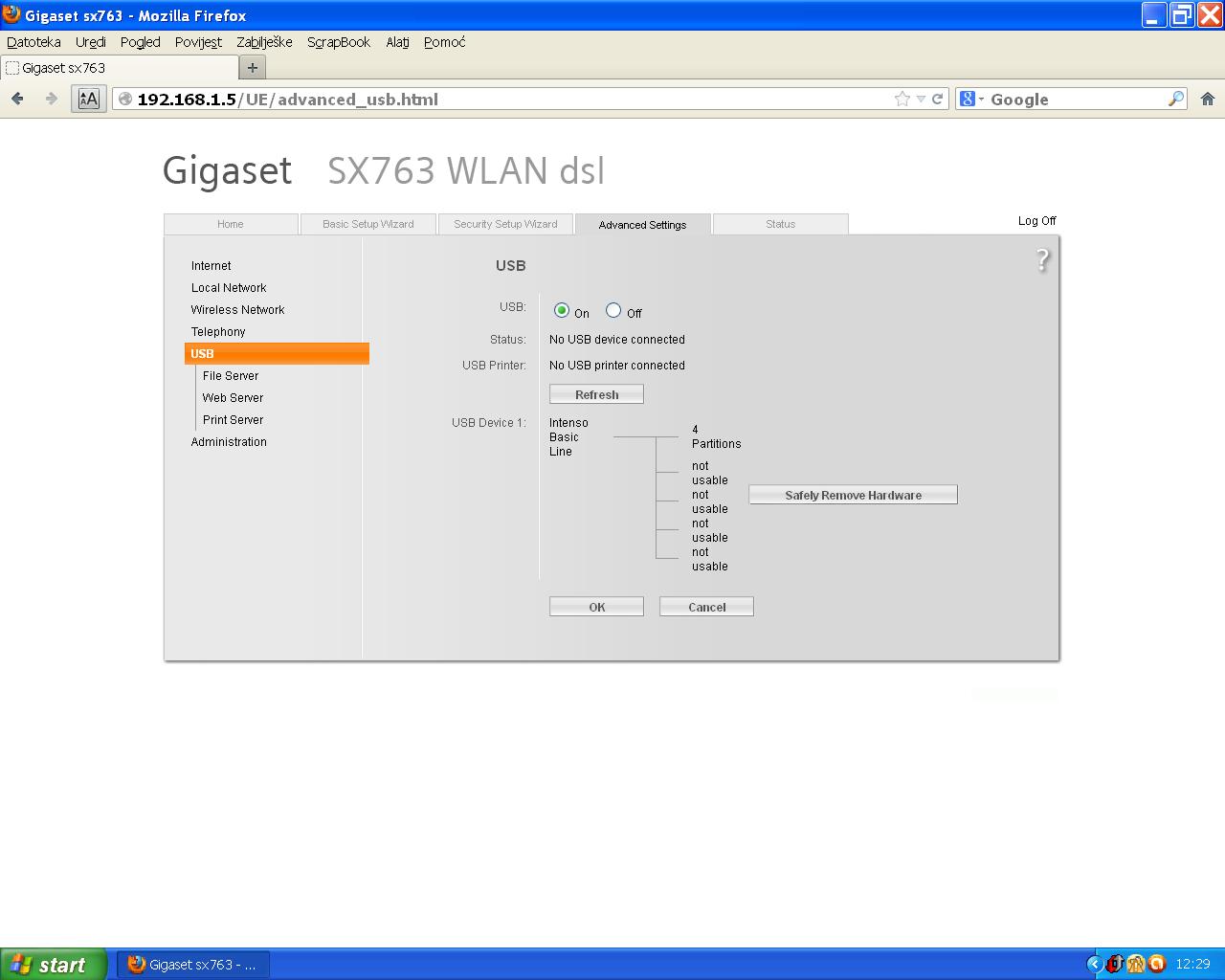 Dobri ljudi molim pomoć. Pokušavam napraviti File server ali modem nikako neće očitati USB stick. Kad ubacim stick ne upali se ni LED dioda koja bi trebala signalizirati da je stick spojen na USB. U system log-u vidim da je modem skužio da je USB stick spojen ali ne prepoznaje particiju i file system. Stick je 8 GB a file system je FAT32, i ima samo jednu particiju-primary. Molim recite što napraviti. Modem sam još davno otključao po uputama na ovom forumu. Na modemu je Firmware version: 4.3.52.21.01, Bootcode version: Primary: 4.1.24.52.12 Secondary: 4.1.28.52.12 Configuration file version: 284714-12_DCFG_BL-52.11.300_TRIPLE_PLAY evo kako to izgleda: a evo i ispisa System Log-a : Jan 4 18:41:54 Err Jan 4 18:41:54 War Jan 4 18:41:54 War Jan 4 18:41:54 Err Jan 4 18:41:54 Err Jan 4 18:41:54 War Jan 4 18:41:54 War Jan 4 18:41:54 Err Jan 4 18:41:54 Err Jan 4 18:41:54 War Jan 4 18:41:54 War Jan 4 18:41:54 Err Jan 4 18:41:54 Err Jan 4 18:41:54 War Jan 4 18:41:54 War Jan 4 18:41:54 Err --- Zadnje izmijenjeno od: MikiCool. 02.04.2013. u 18:40. |