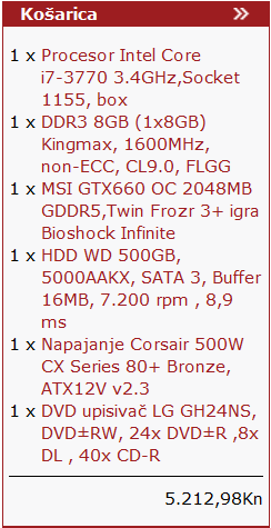 Pozdrav, ako bi mi mogli pomoc bio bi zahvalan, trebaju mi dvije konfe. Jedna od oko 6500kn. Druga od 7500kn ali sve u linksu. Konfiguracije nazalost nisu za mene nego za poznanika koji kaze da ima neki kupon??? u linksu kojim moze smanjit cijenu za oko soma kuna. Meni je to malo sumnjivo ali ajde, ako vam se da slozit konfu iz linksa, super, ako ne nema veze. Komp je namjenjen gamingu, treba mi samo kutija. Sumnjam da ce bit ikakvog klokanja ili ikakvih slicnih radnji. Hvala Zadnje izmijenjeno od: orbital_station. 12.09.2013. u 14:35. |