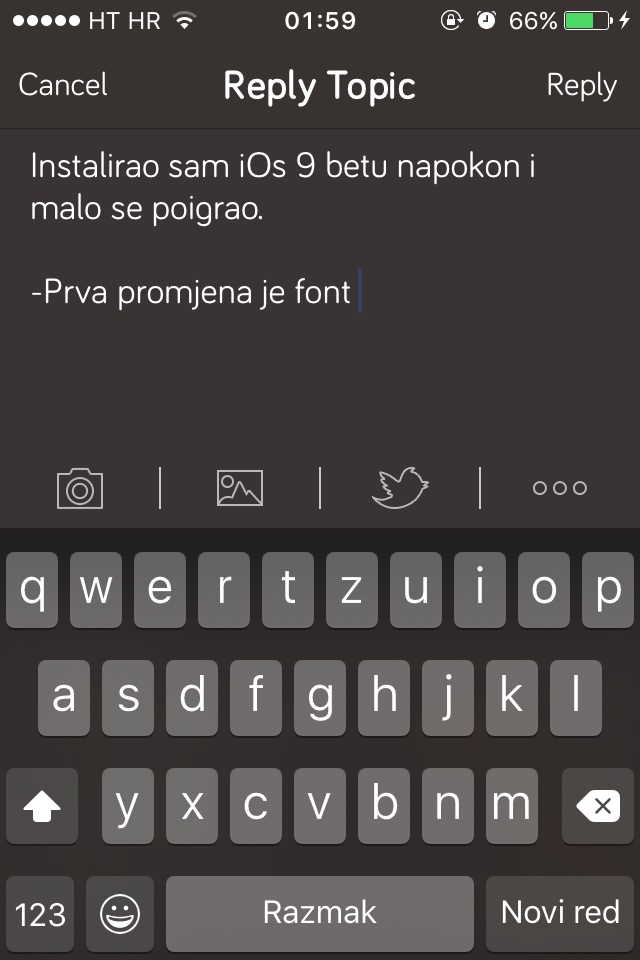 Instalirao sam iOs 9 betu napokon i malo se poigrao. -Prva vizualna promjena je font, koji mi je ok, tipkovnica ostaje ista kao i prije. - Verzija samog iOsa je 9.0 Doradili su Notes mogu se dodavati slike unutar poruke, checkboxovi, tipa za obavljenje zadatke, Liste itd. Mogu se raditi folderi, npr. Lista za posao, privatne liste .. "Multitasking" - zatvaranje apova sad ima novu animaciju, glađa je i lijepse funkcionira, ako je manje "pregledna" jer su aplikacije blize jedna drugoj. Kod "Photos" aplikacije dodani su folderi za selfije i screenshote, vrlo korisno kad imate preko 1000 slika. Tu je i Low power mode, jos ga nisam isprobao, no ima vremena. Prvo me zanima koliko ce trajati baterija. Siri mi nikad nije bila zanimljiva, pa tu ne znam ako se ista promijenilo jer ju nikada nisam koristio. Settings dio je dobio par dobrih stvari. Search opciju koja je vrlo korisna. To sam za sad brzinski polovio. Moj mob : 4S 16gb. I velicina bete je 1.3 Gb za 4S... |