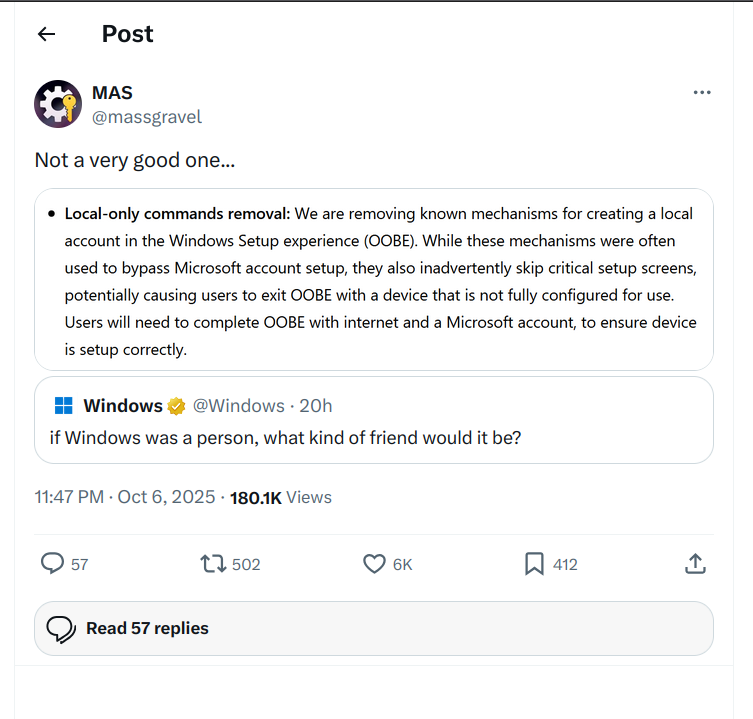 MAS @massgravel · 13h Domain join option for offline accounts is still available for Professional edition and above, so Home users are the most affected.