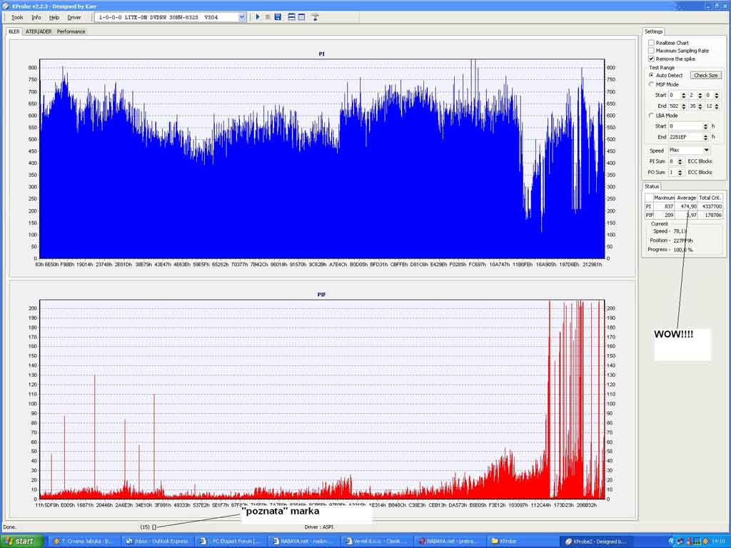 Dakle, radi interesa sam išao ovo skenirati-nije radilo u hitachiju gd 8000(dvd).Sada sam skenirao liteonom 832s.Rezultati su zaprepaštavajući!Broj grešaka je jednsotavno iznad granice nebesa!Užas!Pitao sam se hoće li uopće sken završiti-naišao je na hrpu grešaka, a jedan dobar komad je morao i preskakati! Također, tu su bile i vrlo ozbiljne Servo greške(+ hrpu toga vrlo ozbiljnog), ono što sam uspio skenirati-tu je u attachmentu.Pitam se što je bilo s djelom koji je preskočio... Kvaliteta je užasna, iako DVD, začudo ipak radi!Standard propisuje PI negdje oko 200, ali sve iznad 50 postaje vrlo upitno-mi ovdje prelazimo i 800!Komentari su welcome... |